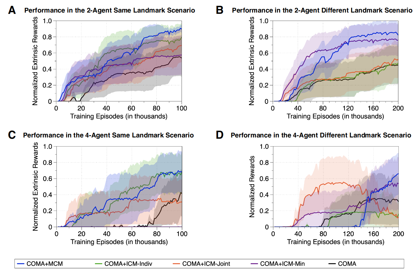 The results show that vanilla COMA is not competitive with methods using an enhanced reward function in all scenarios. The proposed method performs well in all environments, whereas the other methods incorporating an intrinsic reward tend to do well only in the same or different landmark scenarios.